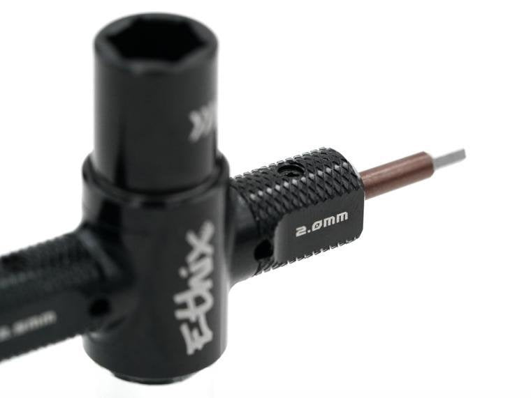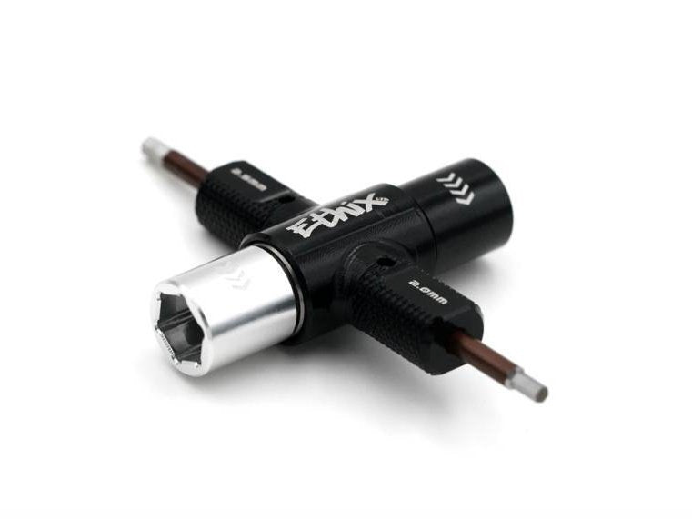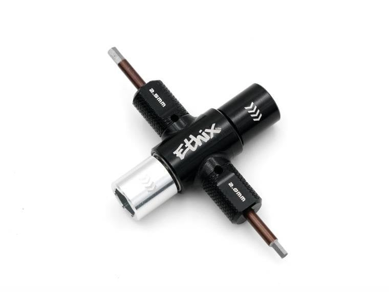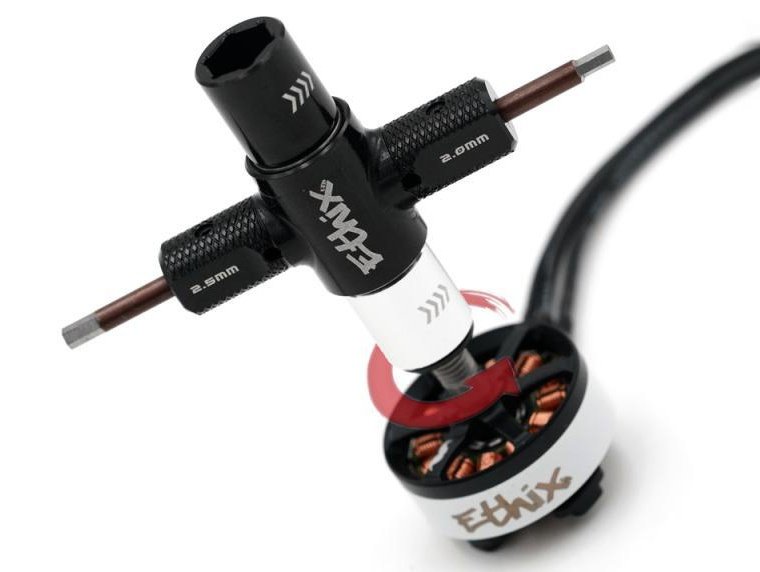 Combining the three most common tools into one tiny and extremely handle little trifecta. Two 8mm prop nut sockets on opposing ends of silky smooth and robust redesigned one-way bearing system enable for quick and smooth prop changes. The silver side is for loosening and black side tightening. These 8mm hex sockets are Accompanied by the most common of all FPV drone bolt sizes 2.5mm and 2mm hex drivers. This tool is all you’ll ever need in a pinch and will outlast your aircraft many times over.