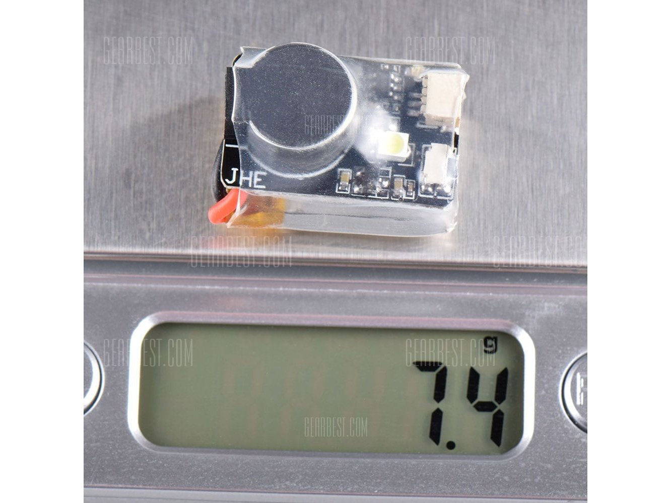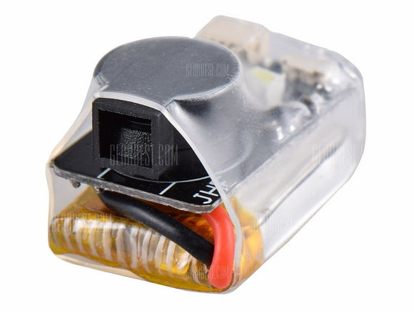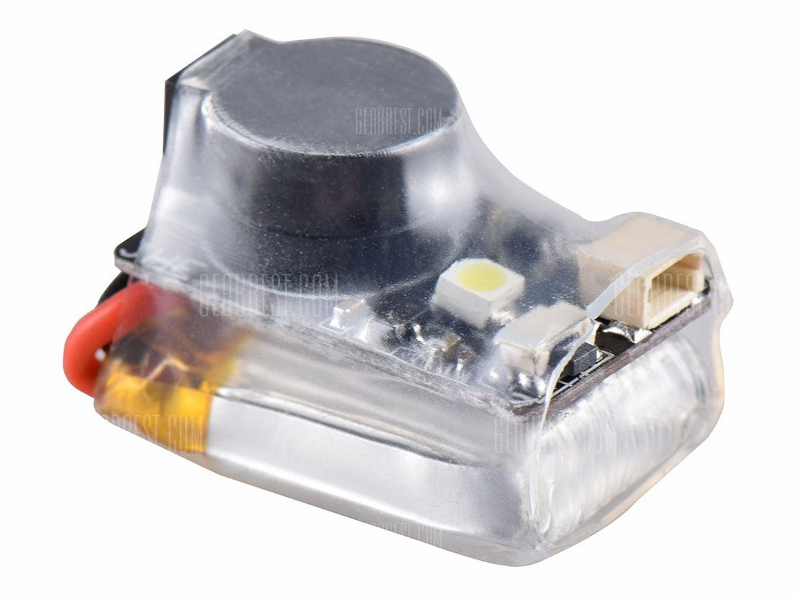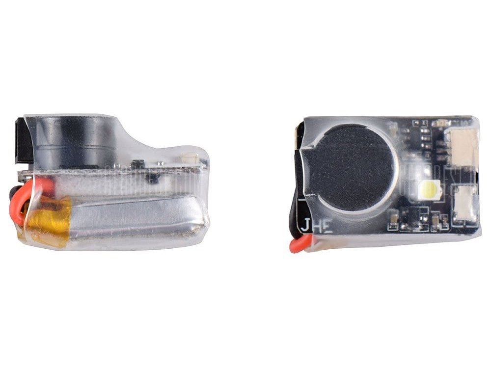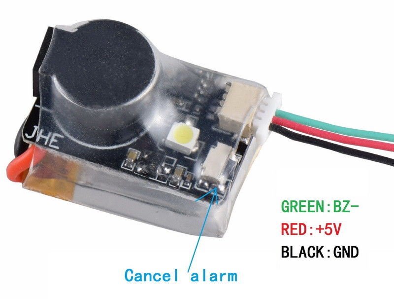 Buzzer, with built in lipo, for connecting to flight controllers. Works as active buzzer in normal operations, but will emit 110dB sound after 30 seconds of power failure. Perfect for situations where batteries disconnect after a crash.