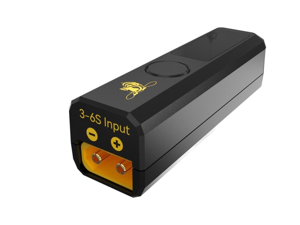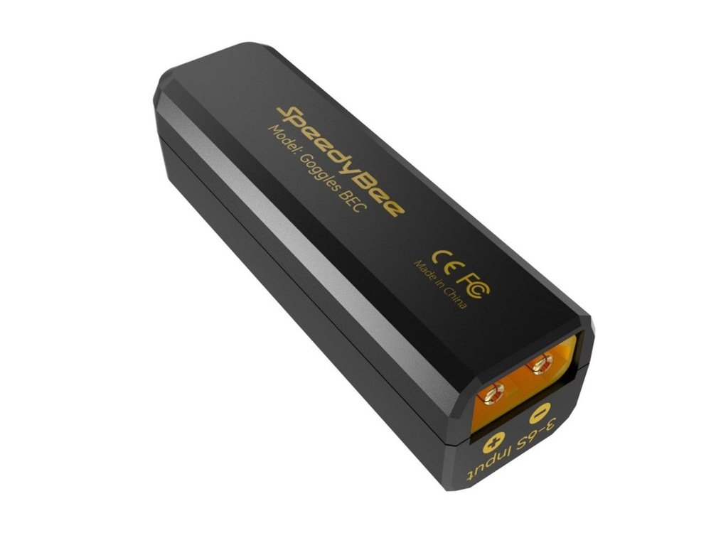 The Speedy Bee Goggles BEC is the perfect accessory for powering your expensive FPV Goggles. It takes any 3-6S battery with XT-60 connector and outputs filtered 9.2V through the USB-C connector to your goggles. With the low voltage and temperature alarms, you are sure to be safe from losing power while flying. This accessory also doubles as a fast charger for your phone or any other electronic device.
