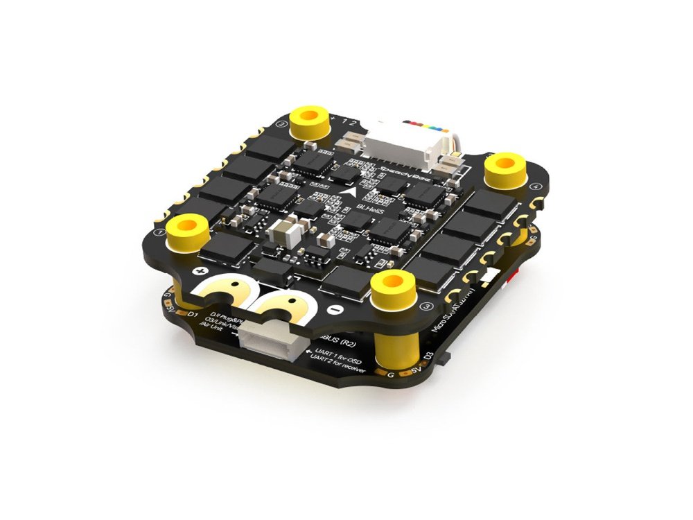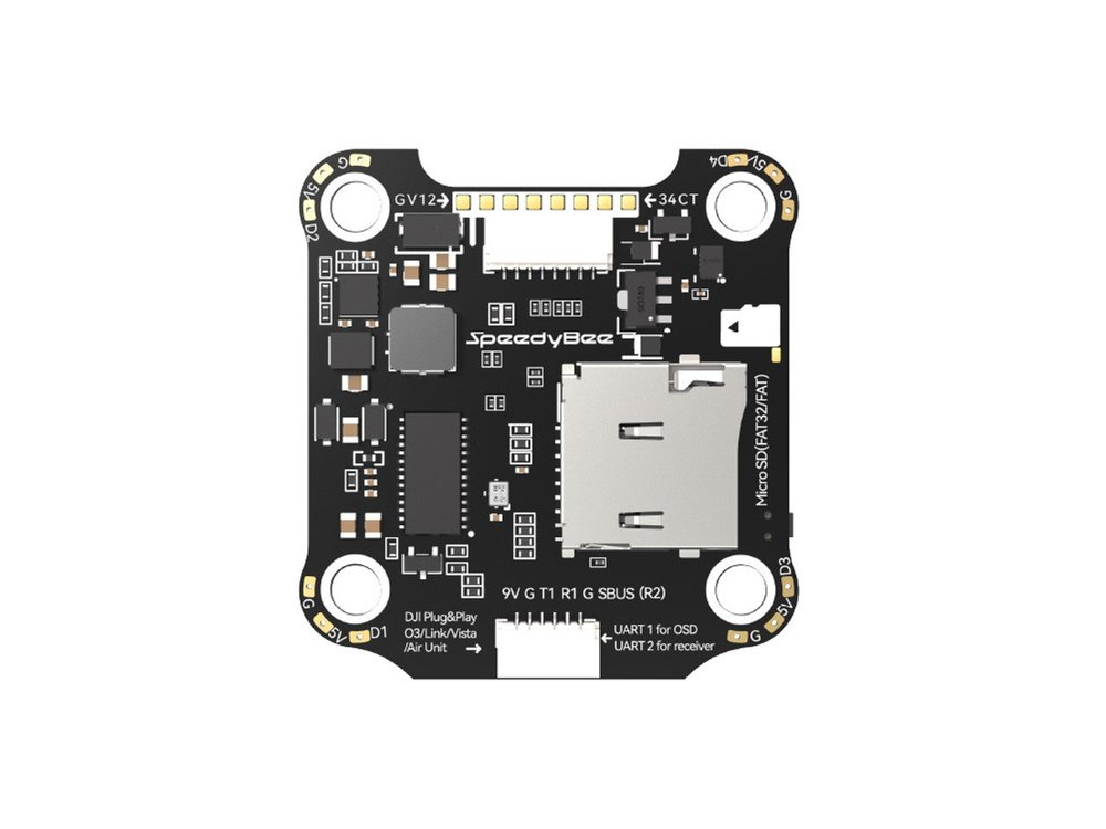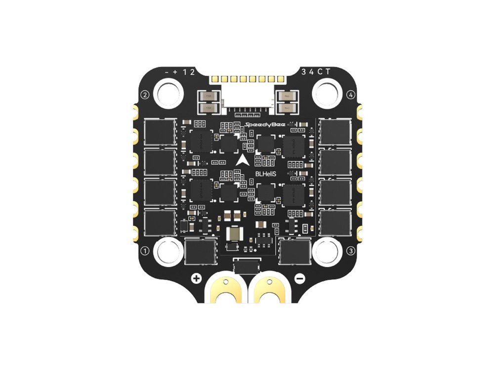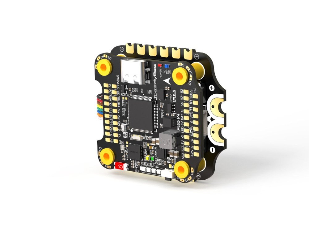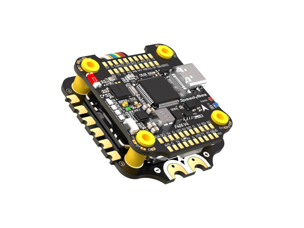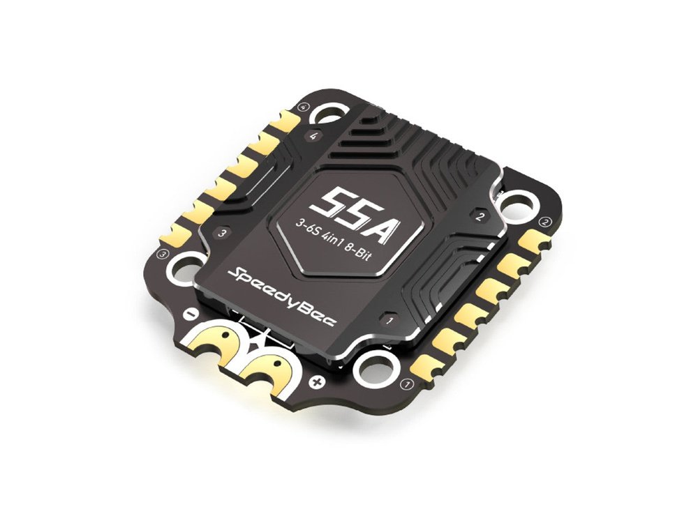 The Speedy Bee F405 V4 55A BLHeli_S 30x30 Flight Controller and ESC Stack include all the features a user would expect from a modern flight controller and ESC stack at an incredible price. The flight controller features the STM32F405 MCU, onboard 4-level battery life indicator, Micro-SD card slot for Blackbox logging, 4 groups of LED strip pads, DJI plug for digital quads, dual gyroscope power supply filtering, dual 5V & 9V BECs with up to 3A output, barometer, support for up to 8 motors, and built-in Bluetooth and WiFi for wireless configuration through the SpeedyBee App. The 55A 4-In-1 ESC now comes in an aluminum alloy heat sink for better heat dissipation and durability, features a built-in TVS protective diode, Japan-made TDK SMT capacitors, and even comes with a low ESR 1000uF capacitor.