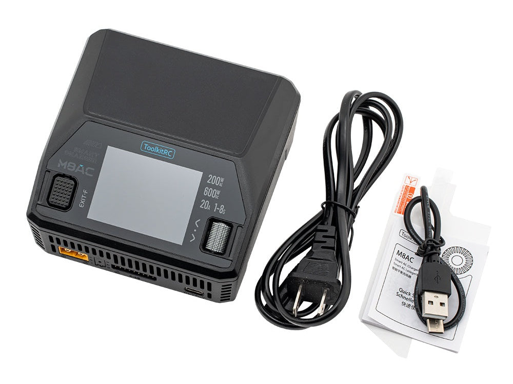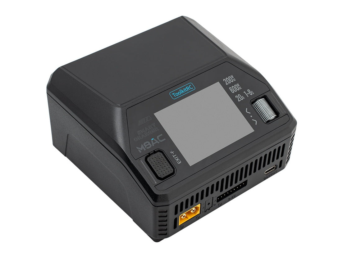 Introducing the ToolkitRC M8AC Smart AC Charger. With highly integrated technology, a robust 1000ma balance current, and high balance accuracy <0.005V, experience a charger made for today's high battery charging demands. It has a 65W super flash charger and a 2.4" IPS LCD display with high accuracy. Perfect for anyone looking for a charger for their hobby.