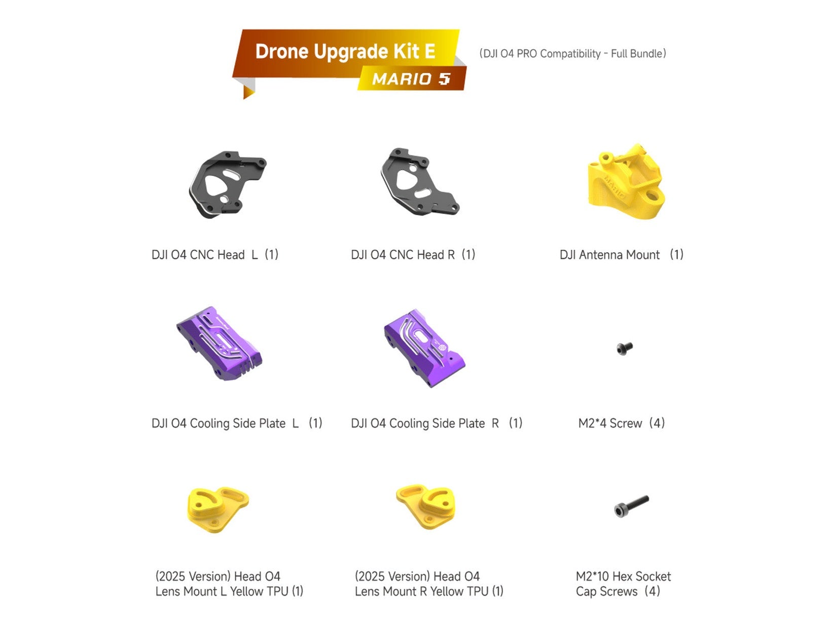 Add DJI O4 Pro compatibility to your Speedybee Mario 5 DC or XH frame. Includes the parts necessary to mount the O4 camera and VTX, along with extra cooling side plates.