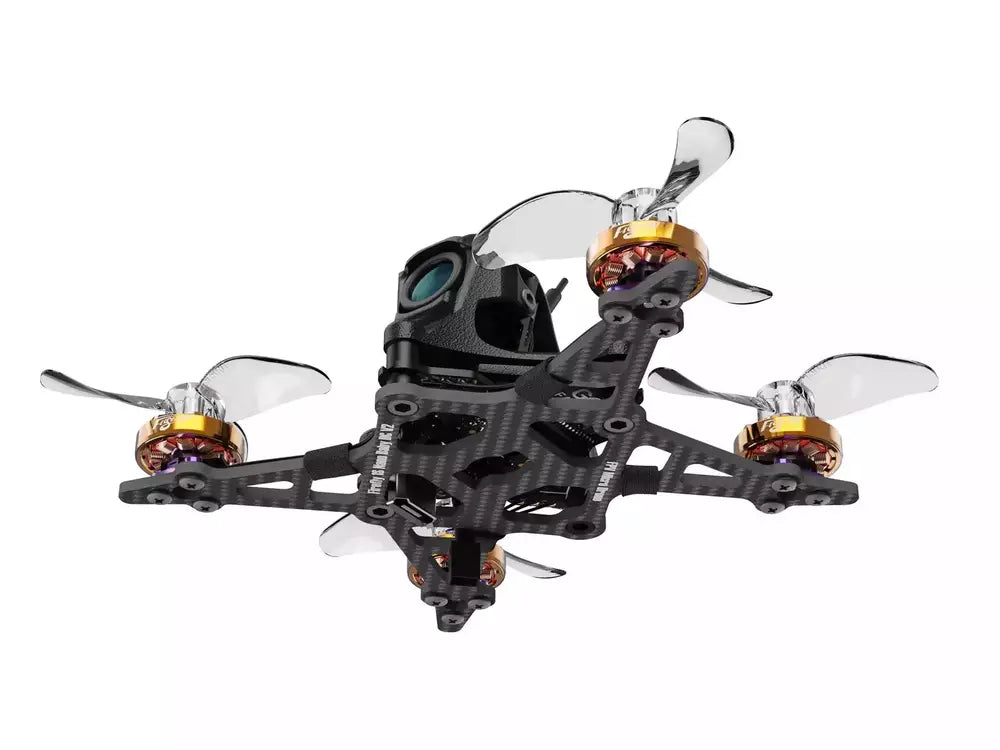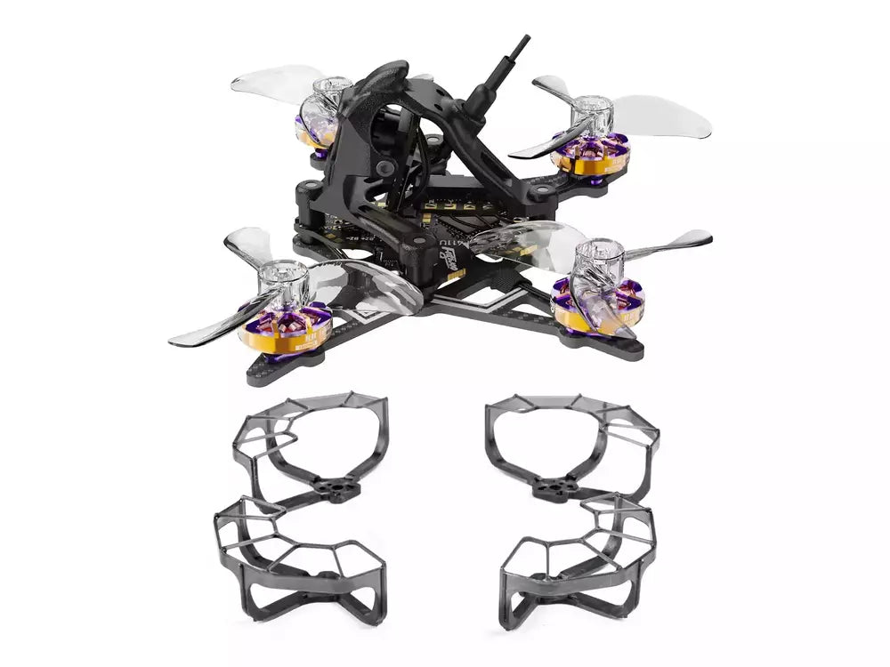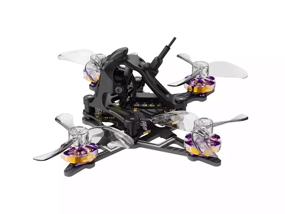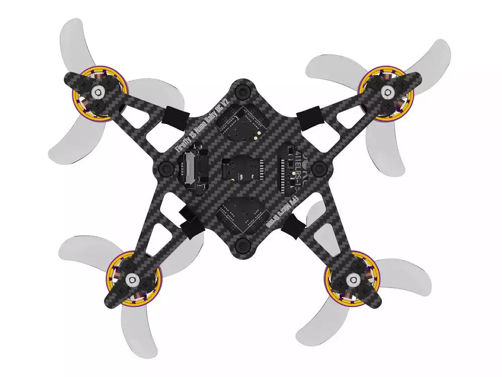 We designed a new canopy for the Firefly 1S Nano Baby V2 to reinforce camera protection and introduced a new bottom plate, resulting in a more sturdy and crash-resistant aircraft. The drone is also equipped with a competition-grade ROBO 1002 19800KV motor (a special gold-purple edition)