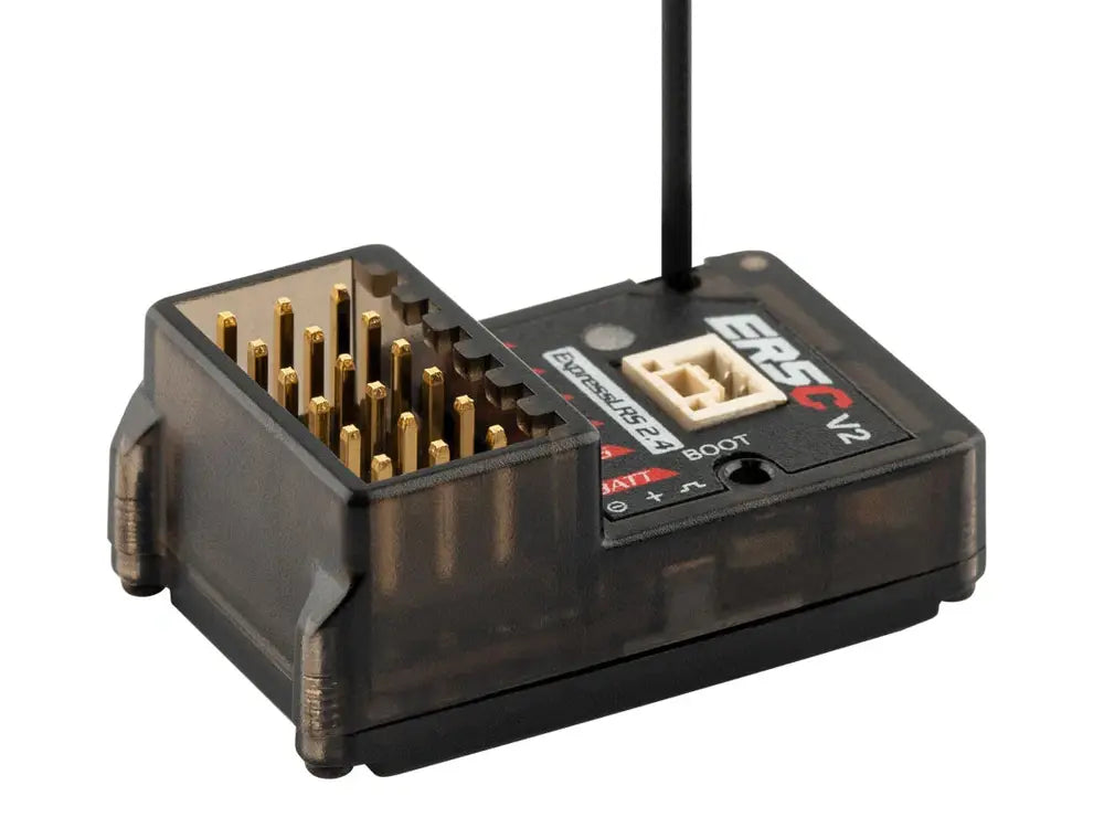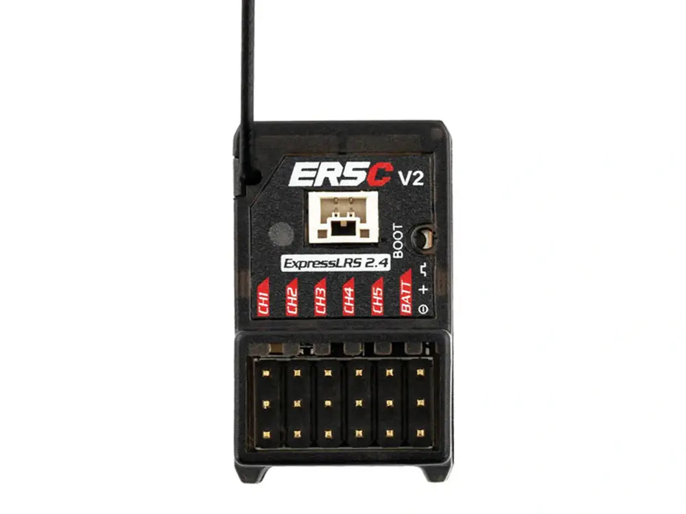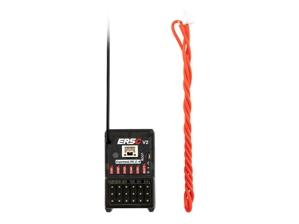 The ER5C V2 ELRS receiver can drive up to 5 servos and has built-in receiver voltage telemetry and battery telemetry with the ability to automatically detect which voltage input to use. It is designed for all types of surface & marine R/C applications.
