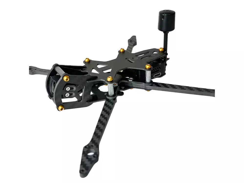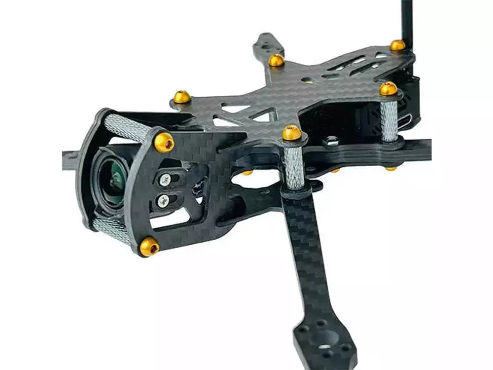 While the frame was designed specifically around the Caddx Vista FPV system, analog FPV gear will work just fine. The rear section has 20x20 mounting holes that line up with the vista unit, and the top plate has a little notch to keep your antenna centered along the rear standoff. This design allows you to simply use a zip tie to mount your antenna without the need for a 3D-printed part. The front camera cage is spaced for a 20mm DJI camera, however, smaller 19mm micro analog cameras work just fine. There are double-slotted mounting holes for the DJI camera as well as a dedicated center hole for cameras such as the Nebula Pro HD, which provides 0-35 degrees of tilt. The cam cage features an innovative plate-lock design that ensures maximum camera protection while ensuring that the cage won't pop-out in a crash.